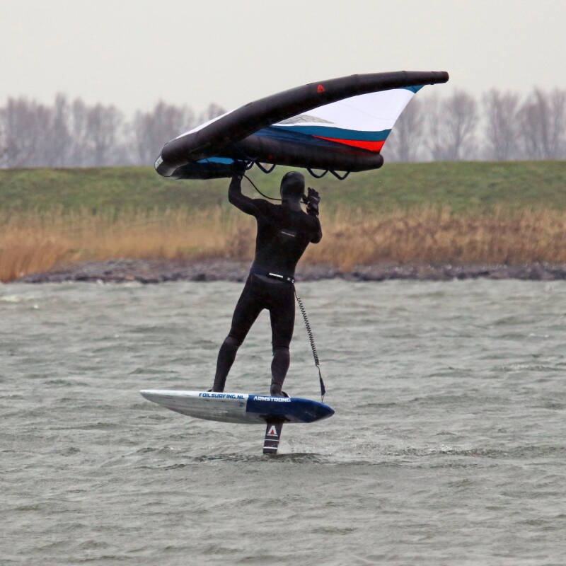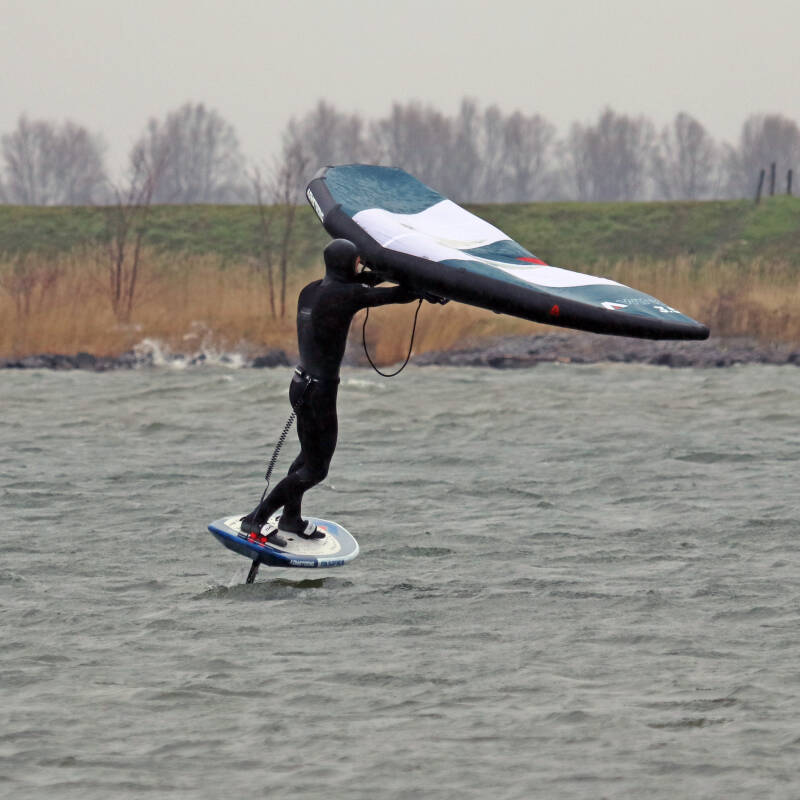 Continue to steer downwind. While doing this you will increase speed, causing the foil to pitch up. Compensate by focusing on driving the board. Keep it parallel to the water. Do not focus on your wing. It will fly neutral with the wind.