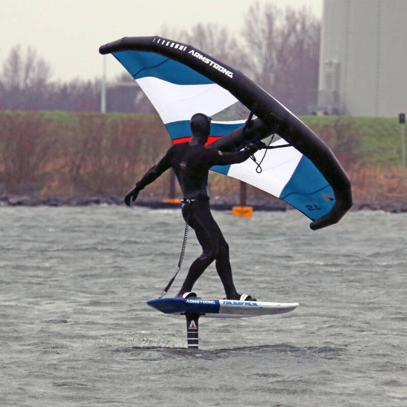 The wing is now above you. Grab the back handle with your free hand, still keeping your wing in a neutral position.