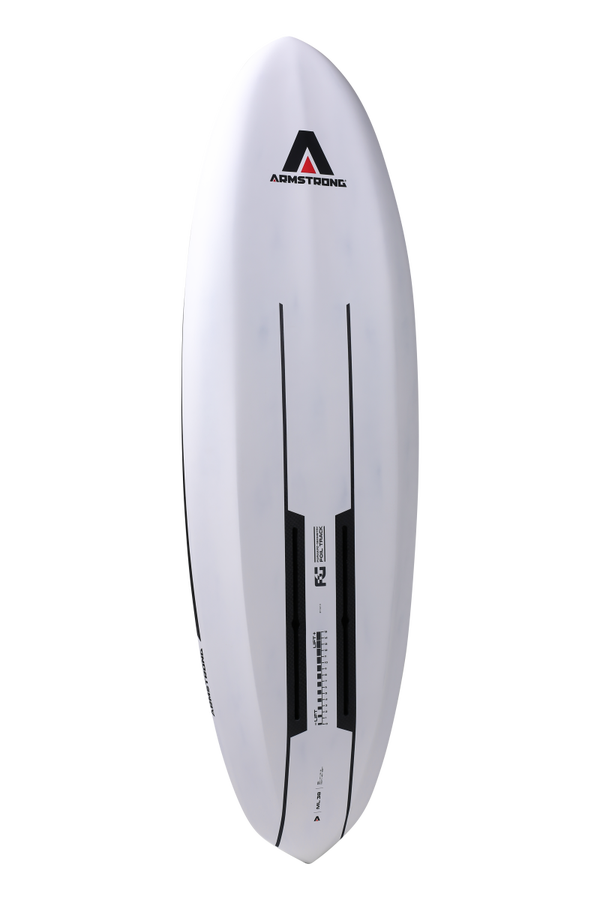 - Bottom: Pulling from the Downwind boards, a subtle double concave at the nose works its way flat at the foil tracks and finally into the diamond-V tail shape for a quick pop up and maximum un-stickiness when touching down. If a board ever wanted to stay in the air, this would be it.